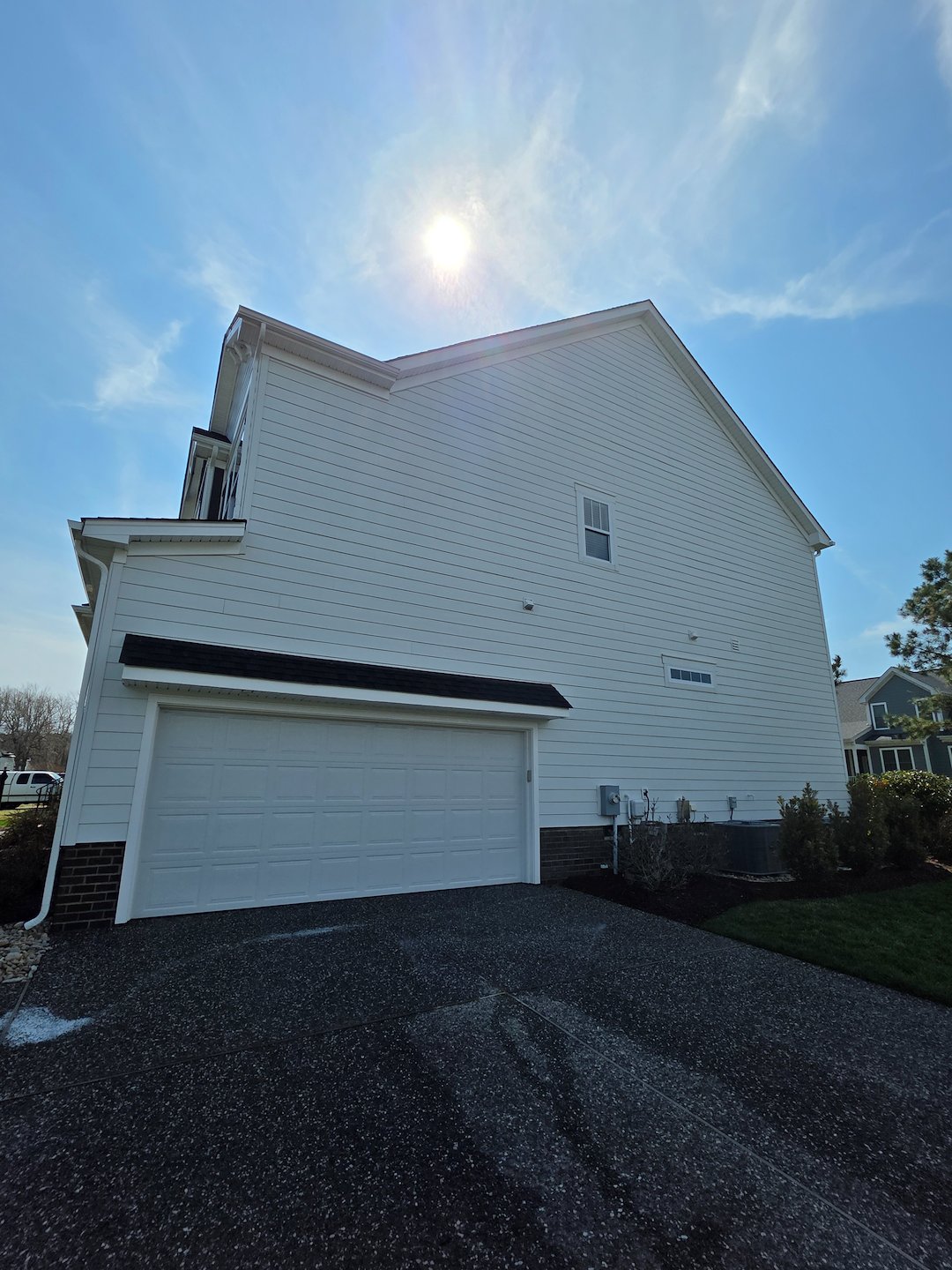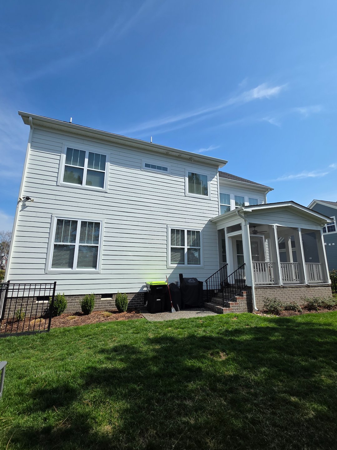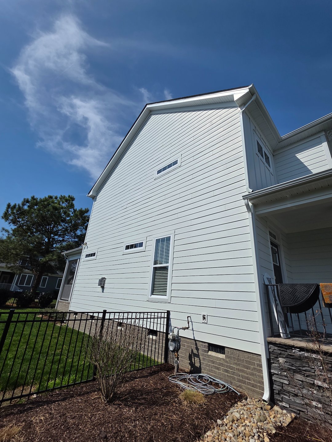 This house washing project was on a beautiful five year old home in Founders Point, Suffolk Va. The front of the home, north facing wall, had many areas of organic growth beginning to accumulate especially on the facia and soffit. We used our softwash system to properly treat the entire house. We also took time to rinse any grass and plants that possibly had over spray as it was a windy day. At Drum Creek Wash Company we take all precautions to ensure that no damage occurs while softwashing your home. This house washing also included a screen porch that needed attention. We can easily clean screens, furniture, ceilings and floors with our low pressure method. I would like to personally thank Jay and Heather for choosing Drum Creek Wash Company and trusting us with their house washing project.